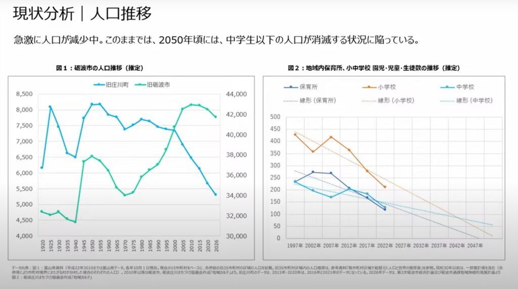 旧砺波市は大きな人口減少は起こっていませんが、旧庄川町は急激な人口減少が起こっています。このまま放置すると、経済活動やコミュニティが崩壊する可能性があります。